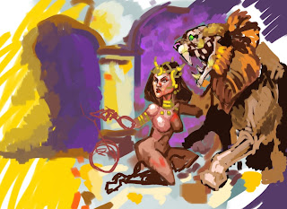 Now more fleshed out, the lava style floor, another idea from a frazetta paintings I keep seeing. Although I must confess the legs look odd, I needed to fix that.